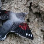 پرندهای زیبا و صخره دوست که به واسطه رنگ قرمز پر و بال و منقار باریک، خمیده و بلندش به آسانی قابل شناسایی است اما به دلیل زیستگاه خاصش به سختی دیده میشود. رنگ کلی بدن این پرنده خاکستری رنگ است که در پرنده نر بالغ تارک سر و گوشپرها خاکستری مایل به آبی است. بخش پایینی صورت، چانه و گلو سیاه رنگ و دمگاه خاکستری کمرنگ میباشد. بالها پهن و گرد و در قاعده باریک هستند. پوشپرهای روی بالها قرمز درخشان، شاهپرهای پرواز در قاعده نیز به همین رنگ و در انتها دودی مایل به سیاه دیده میشوند و چهار شاهپر اولیه در انتها یک لکه کوچک و یک لکه بزرگ سفید دارند که در پرواز طرحی شبیه به هدهد یا بال پروانهها ایجاد میکند. دم در این گونه کوتاه،به رنگ سیاه و در انتها خاکستری است. سینه و زیرتنه خاکستری دودی و پاهای سیاه دارند. پرنده ماده بالغ شبیه به نر در خارج از دوره زادآوری است. تارک سر و روتنه تا حدی قهوهای رنگ، چانه سفید و گلو خاکستری کمرنگ دیده میشود. در دوره جوجه آوری نیز لکه دودی رنگی روی سینه دارد.پرنده نر و ماده در دوره جوجهآوری متفاوت و فقط نر دارای تغییرات فصلی است.