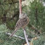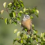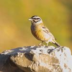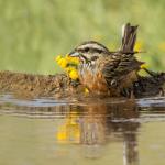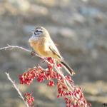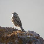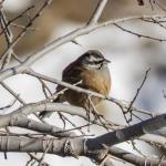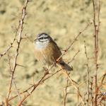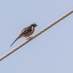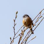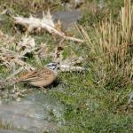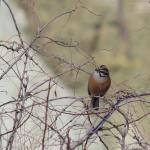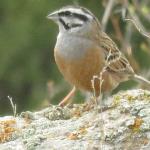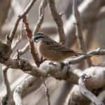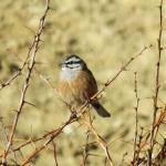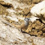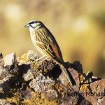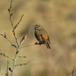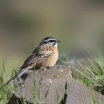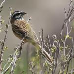 نر و ماده متفاوت و دارای اندک تغییرات فصلی هستند. در پرنده نر بالغ سر، صورت، چانه، گلو و بخش بالایی سینه خاکستری کمرنگ است. در هر طرف صورت سه نوار سیاه مشخص دارد، یکی در حاشیه تارک سر، یک نوار چشمی از قاعده منقار تا نزدیک به پس سر و یک نوار شاربی که در انتها به نوار چشمی متصل می شود. روتنه و شانه ها بلوطی خرمایی با رگه رگه سیاه و دمگاه بلوطی پر رنگ به نظر می رسد. شاهپرهای پرواز قهو ه ای مایل به سیاه و حاشیه آنها نخودی کمرنگ، پوشپرهای کوچک تر روی بالها خاکستری و پوشپرهای میانی در مرکز سیاه و در نوک خود سفید یا نخودی هستند و نوار بالی مشخصی را تشکیل می دهند.