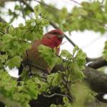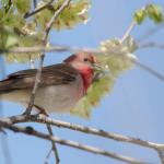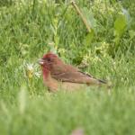 در پرنده نر سر، گردن، چانه، سینه و بخش بالایی پهلو ها و دمگاه قرمز درخشان است. خط چشمی قهوه ای دارد که از قاعده منقار تا گوشپرها امتداد یافته است. روتنه و شانه ها قهوه ای تیره با سایه ای از رنگ قرمز و بالها قهوه ای تیره با حاشیه ای صورتی دیده می شود. نوک پوشپرهای میانی روی بالها روشن و تشکیل نوار بالی مشخصی می دهد. بخش پایینی سینه، شکم و پوشپرهای زیر دم مایل به سفید همراه با سایه ای به رنگ صورتی و رگه رگە کمی در بخش پایینی پهلوها به چشم می آید. چشمها قهوه ای تیره و پاها قهوه ای دودی است.