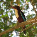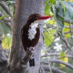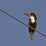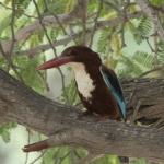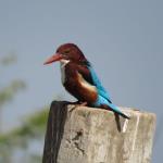 ماهیخورکی درشتجثه که به واسطه بدن رنگین و منقار دراز، ضخیم و قرمز به آسانی از سایرین قابل تشخیص است. نر و ماده همشکل و فاقد تغییرات فصلی هستند. در پرنده بالغ سر، گردن، شکم، پهلوها و خم بالها قهوهای بلوطی است. گلو و سینه سفید و روتنه، دمگاه، دم و بخش عمدهای از روی بالها آبی روشن دیده میشود. در پرواز، شاهپرهای اولیه سفید و نوک آنها سیاه به نظر میرسد. پاها نیز قرمز نارنجی است. پرنده نابالغ شبیه به بالغها است، اما کمرنگتر و ماتتر، با سینه راهراه و منقار زرد نارنجی و در قاعده تیره دیده میشود.